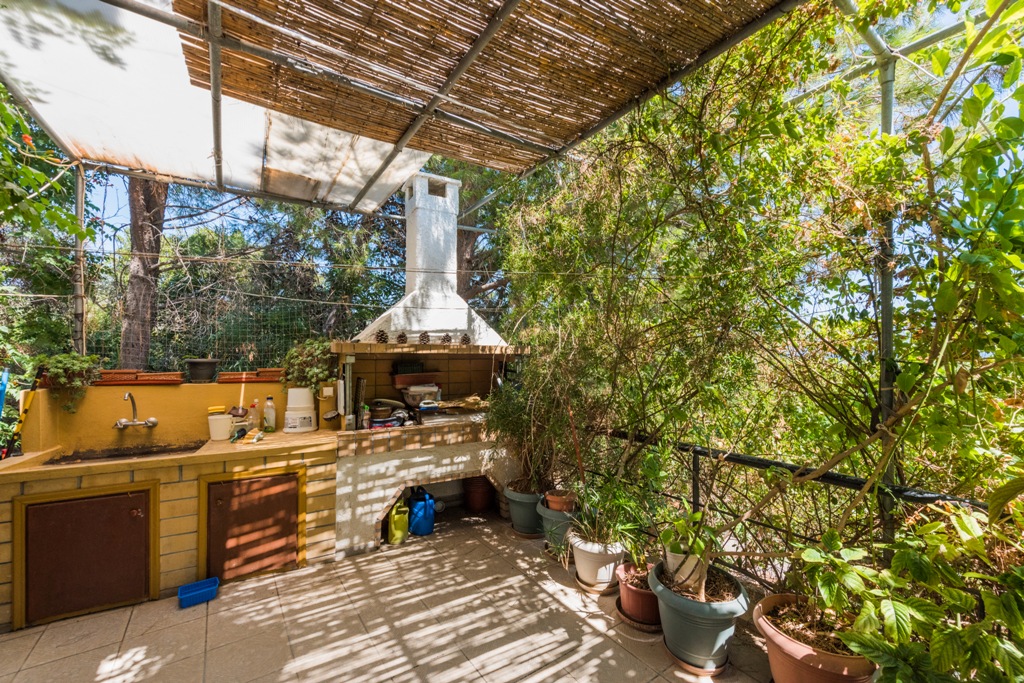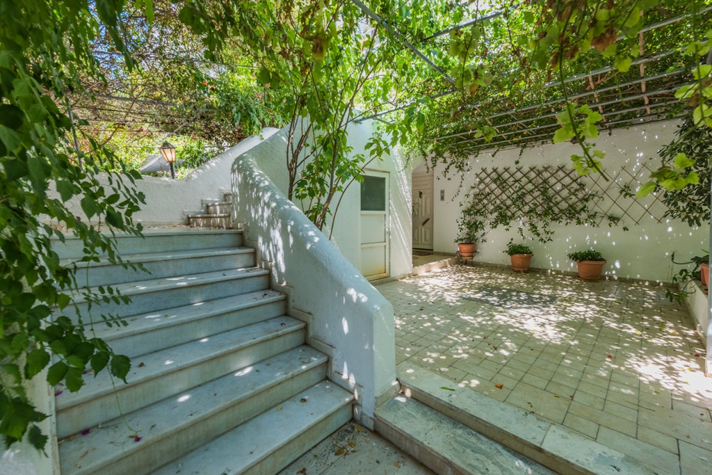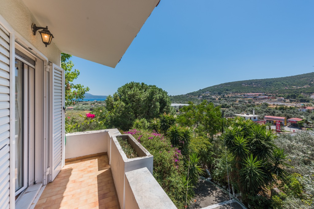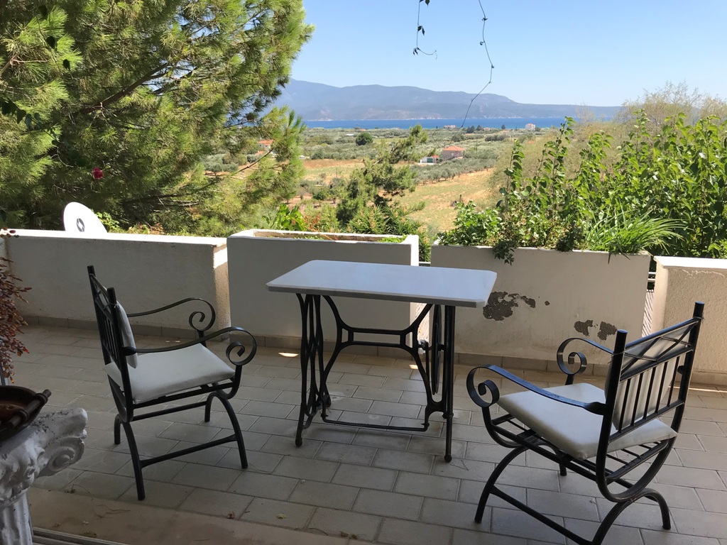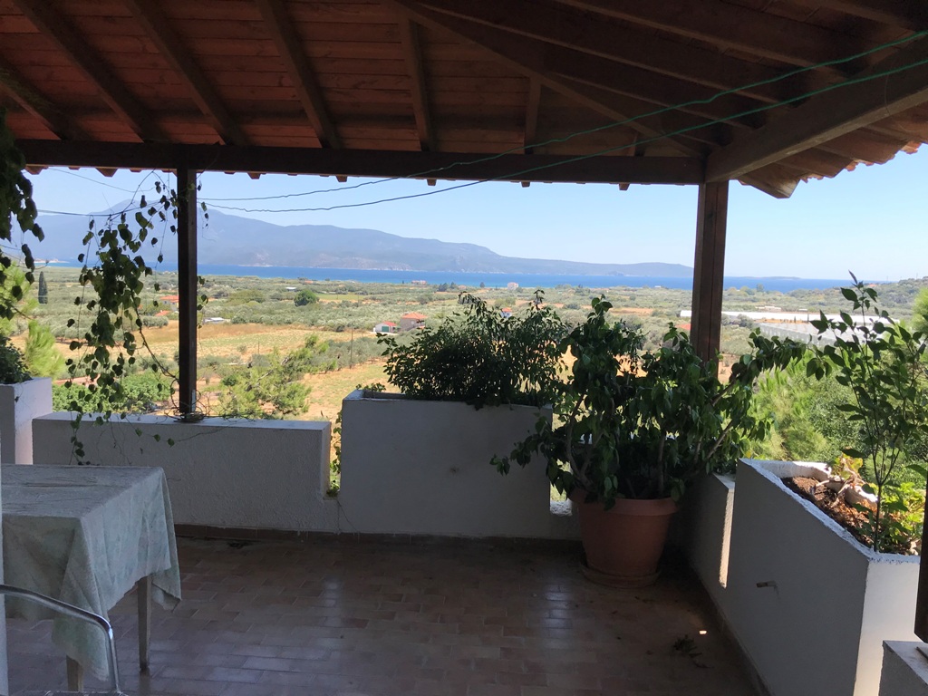 Έχει πρόσβαση σε μεγάλη σκεπαστή βεράντα εμβαδού 60,00 τμ. με barbeque και καταπληκτική θέα στον κάμπο και τη θάλασσα.