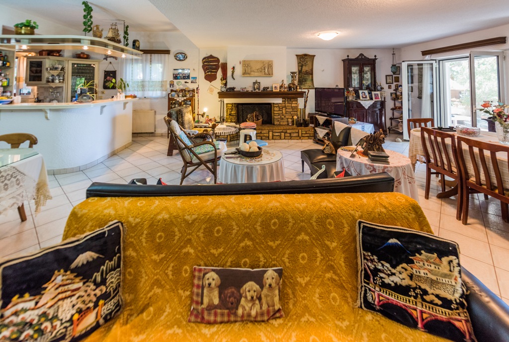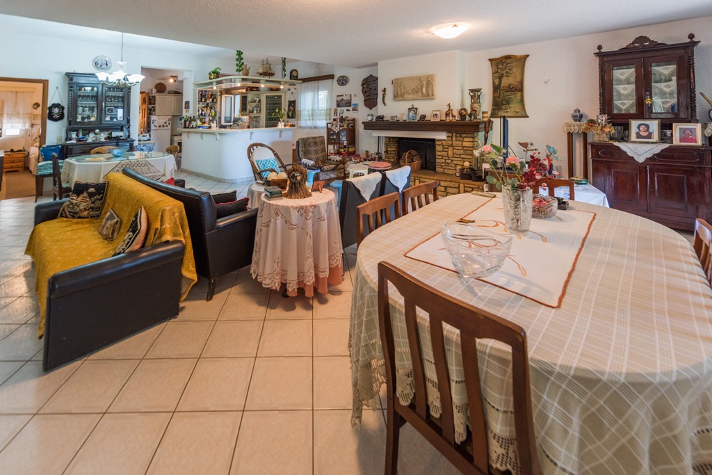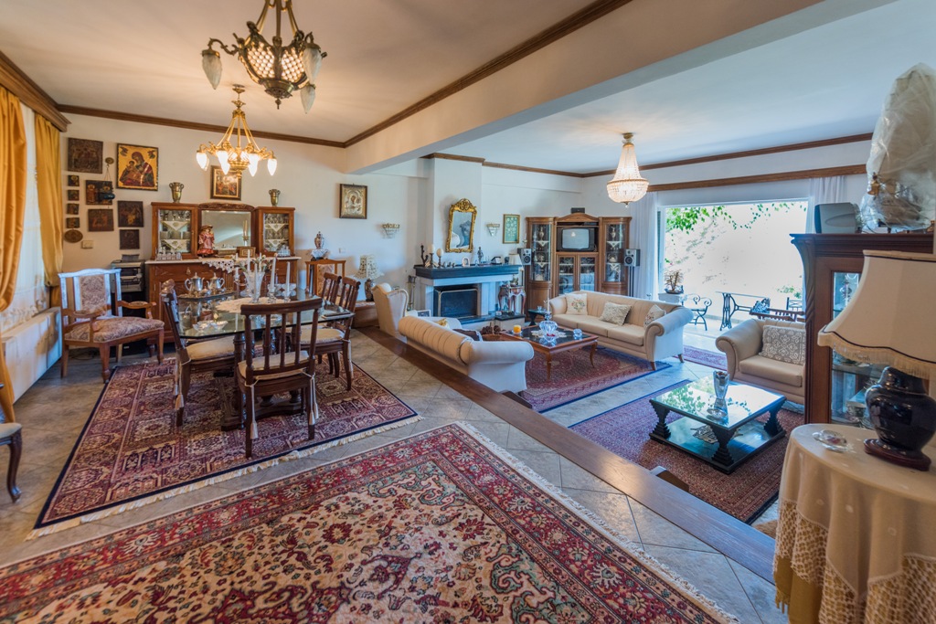 Στο πρώτο επίπεδο εμβαδού 122,90 τμ., βρίσκεται ένα ευρύχωρο, φωτεινό σαλόνι με τζάκι, επενδεδυμένο με μάρμαρο Διονύσου και τραπεζαρία, άνετη κουζίνα, εργονομικά σχεδιασμένη και απόλυτα λειτουργική καθώς διαθέτει στην προέκτασή της και ένα μικρότερο αλλά ιδιαίτερα χρήσιμο χώρο βοηθητικής κουζίνας για την προετοιμασία των γευμάτων. Το σκεπαστό μπαλκόνι σε συνέχεια του σαλονιού, εμβαδού 15,00 τμ. έχει καταπληκτική θέα στη θάλασσα και τα μικρασιατικά παράλια.